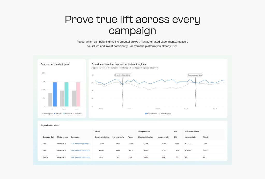 • Incrementality for User Acquisition — Delivers holistic, cross-network lift measurement to reveal the true incremental value of every touchpoint, enabling smarter, faster spending decisions.