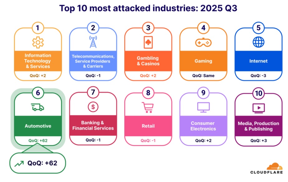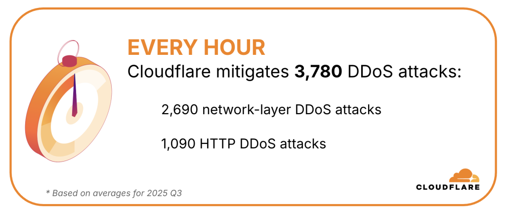 Overall, Cloudflare mitigated 8.3 million DDoS attacks in Q3 alone—a 40% year-on-year rise—bringing the 2025 total to 36.2 million so far, already surpassing all of 2024 by 170%. Network-layer attacks accounted for 71% of all activity and grew nearly 90% quarter-on-quarter, driven by UDP floods, DNS abuse, and persistent Mirai-derived variants.
