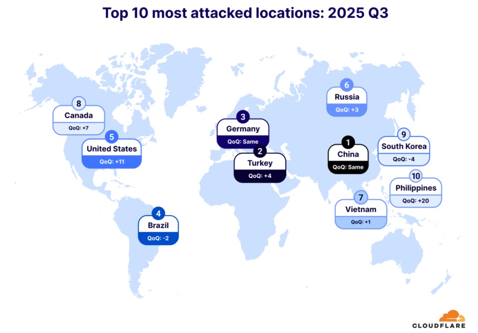 Asia remained the dominant source of attack traffic, led by Indonesia, while China, Turkey and Germany faced the highest attack volumes. Meanwhile, the United States climbed 11 spots, reflecting a growing focus on Western digital assets.