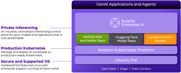 NVIDIA’s government-ready containers have been tested to run reliably on NKP and interoperate with NAI. This provides seamless deployment of the AI Factory for Government using NKP as the Kubernetes base, and NAI to build the shared inference service to operationalize the NVIDIA software components. The joint solution provides consistent performance, simplified operations, and leverages hardened configurations, FIPS encryption, and continuous vulnerability monitoring, making it ideal for regulated environments. NKP can run on virtual machines – often preferred for multi-tenant use cases – or on bare metal servers where there isn’t a need for a virtualization layer. Earlier this year, Nutanix announced that NKP will ship Ubuntu Pro as an additional option with NKP Pro and Ultimate licenses for a validated, well-integrated bare metal Kubernetes stack on which to run your AI workloads.