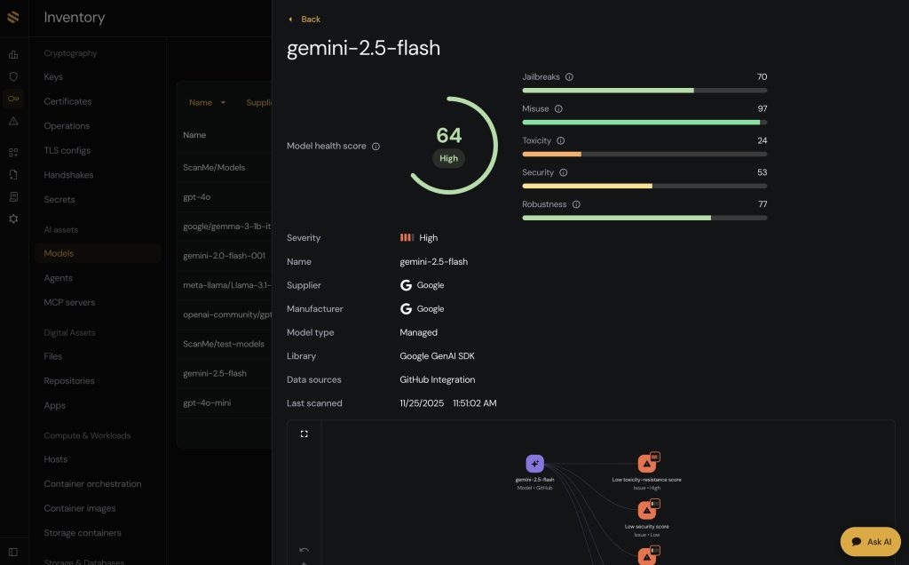 AQtive Guard applies deep inspection from cloud to code, discovering hidden AI assets such as models, agents, and MCP servers. It evaluates them for weaknesses including prompt injection, data leakage, insecure dependencies, and unauthorized access. The platform also provides continuous threat monitoring, AI governance enforcement, and compliance alignment for emerging regulatory requirements.